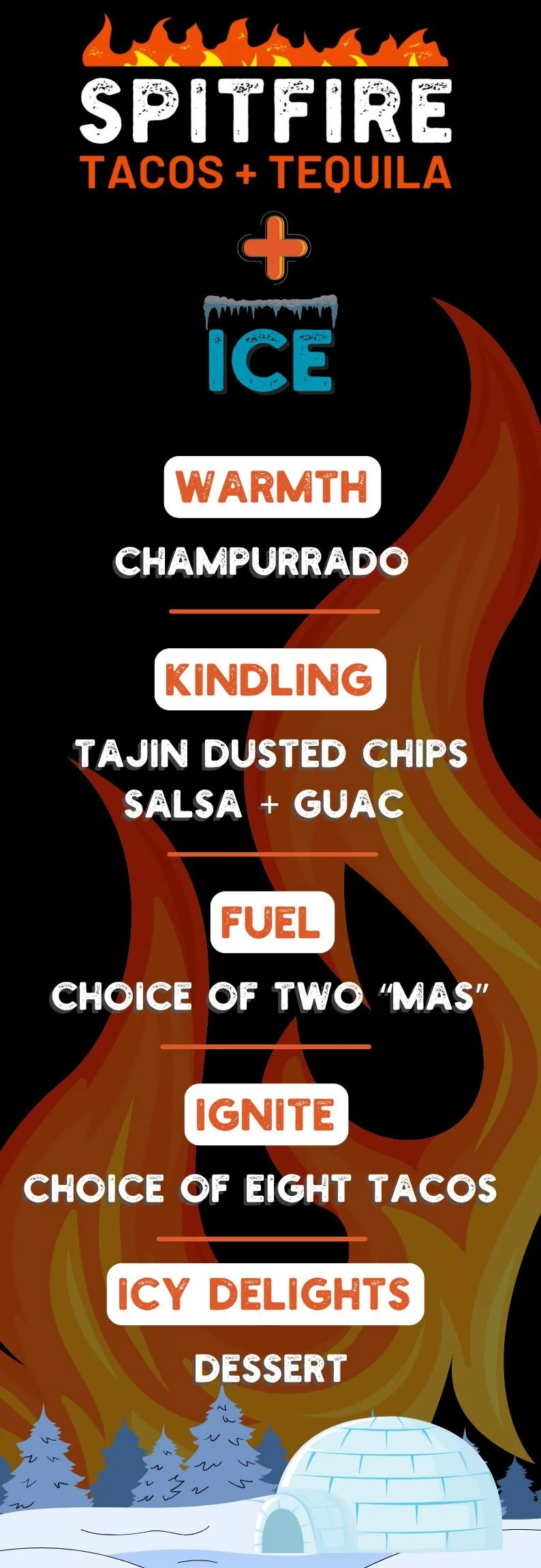 Experience the magic of Spitfire Tacos & Tequila’s Fire + Ice Igloo Experience! 🔥❄️ Enjoy a private, heated igloo with up to four guests while indulging in a delicious four-course meal, perfectly paired with a rich and cozy Mexican hot cocoa. Whether it’s a romantic date night or a cozy gathering with friends, this exclusive winter escape is the ultimate way to dine in style. Reserve your igloo today!